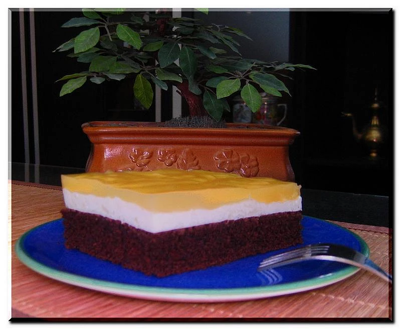 Na koniec ugotować dwa budynie z cukrem w 1 litrze wody. Dla lepszego smaku dodaj trochę syropu lub soku owocowego – i mniej wody. Wylać na bułkę. Nalewamy powoli i ostrożnie, polewa jest gorąca i może się zdarzyć, że zrobi ścieżki w twarogu. Niech stwardnieje na zimno.