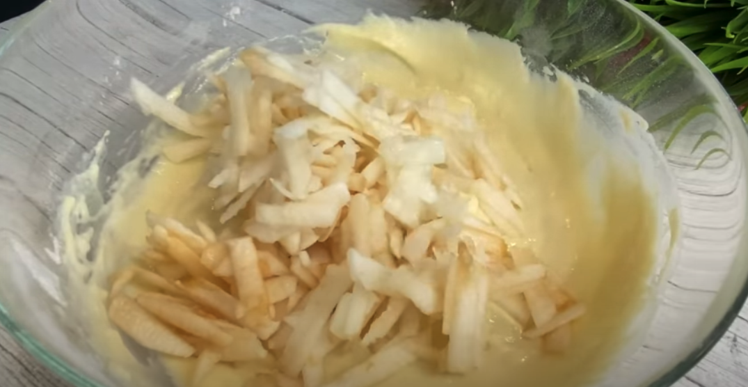 Obierz i zetrzyj jabłko na tarce. Skrop jabłko sokiem z 0,5 cytryny, aby nie ściemniało. W misce ubij jajko z 30 g cukru i 1 łyżeczką cukru waniliowego. Dodaj 150 g jogurtu naturalnego lub kefiru i 2 łyżki oleju roślinnego. Wymieszaj. Dodaj startą jabłko i ponownie wymieszaj.