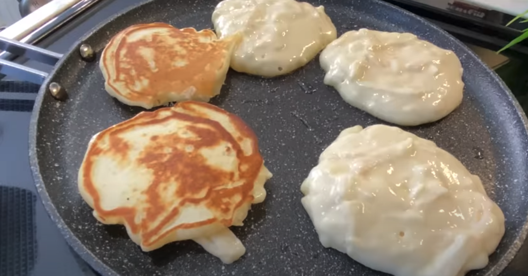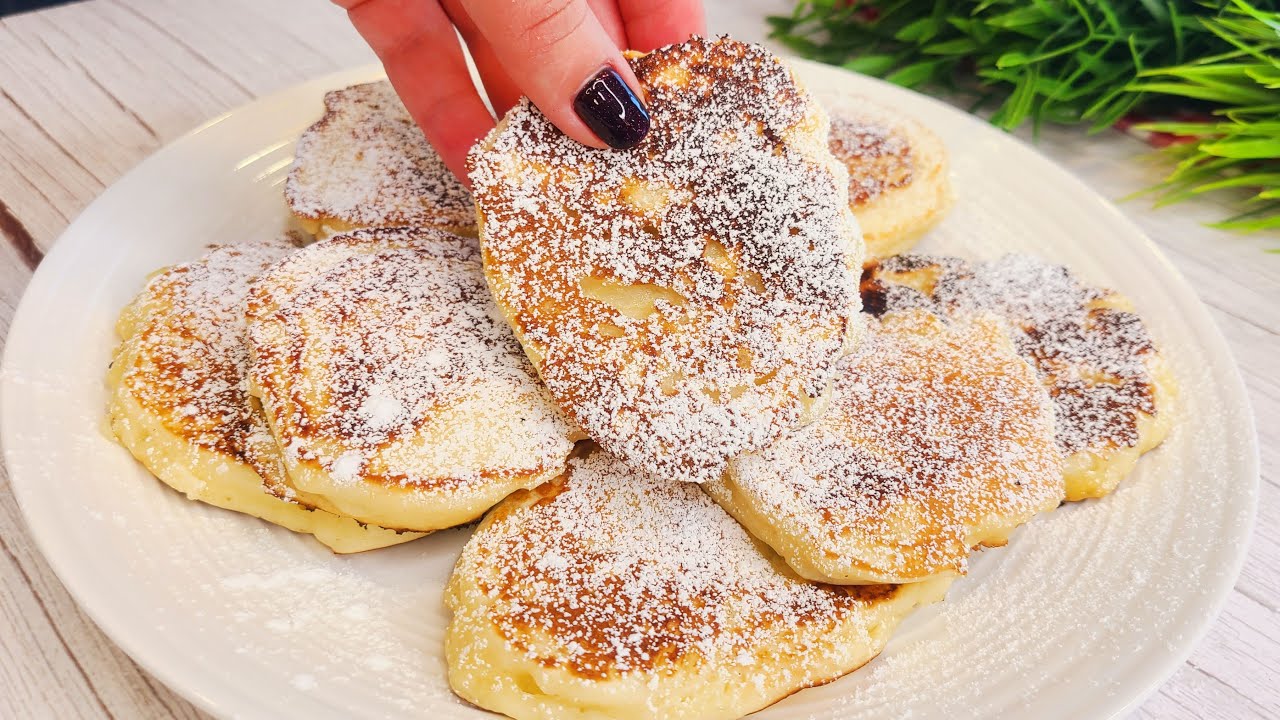 W osobnej misce wymieszaj 140 g mąki z 0,5 łyżeczki proszku do pieczenia. Stopniowo dodawaj suche składniki do mokrych, mieszając, aż uzyskasz gładkie ciasto. Rozgrzej patelnię na średnim ogniu i dodaj 1 łyżeczkę oleju roślinnego. Nakładaj porcje ciasta na patelnię i smaż placuszki na złoty kolor z obu stron. Placuszki posyp 1 łyżeczką cukru pudru. Podawaj na ciepło.