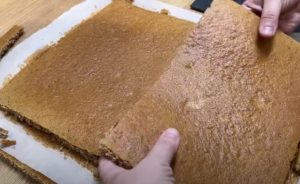 Blachę wstawić do nagrzanego do 180°C piekarnika i piec 25 minut. Po ostygnięciu zdjąć papier do pieczenia i wykrawać 2 równe części brzegiem ciasta o wymiarach 30×20 centymetrów. Drobno posiekaj pozostałe skrawki.