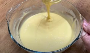Jajka, cukier waniliowy i cukier umieścić w misce i ubijać do powstania piany. Następnie wlej mleko, olej i na koniec mąkę i proszek do pieczenia. Wymieszaj ciasto, dodaj do niego zmielone orzechy włoskie i dobrze wymieszaj. Blachę o wymiarach 40×30 cm wykładamy papierem do pieczenia i wylewamy na nią ciasto, które równomiernie rozprowadzamy szpatułką.