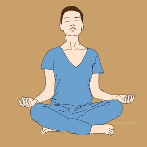 W pozycji siedzącej po turecku zrelaksuj się. Delikatnie podnieś kręgosłup oraz szyję, opierając dłonie na kolanach. Oddychaj spokojnie i głęboko, co wpływa kojąco na twoje mięśnie i umysł.
