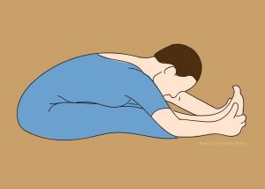 Siadając z prostymi nogami, dotknij stóp obydwoma rękami. Podczas głębokiego wdechu, Twoje ciało staje się bardziej elastyczne. Skoncentruj się na odpowiednim oddechu i relaksacji. Wykonaj to pięć razy.