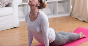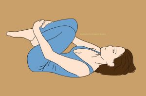 Z rękoma wyciągniętymi przed siebie, przyciśnij lewe kolano do klatki piersiowej i obróć całe ciało w prawą stronę, nie odrywając rąk od podłogi. W tej pozycji kość ogonowa odczuwa ulgę.