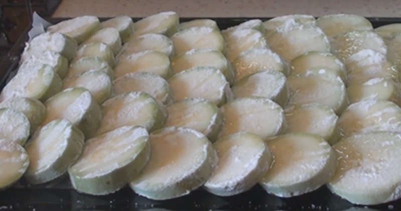 Umyj cukinię pod bieżącą wodą, a następnie odkrój obie końcówki. Przygotowane warzywa pokrój w średniej grubości plasterki, a następnie obtocz je w samej mące.
