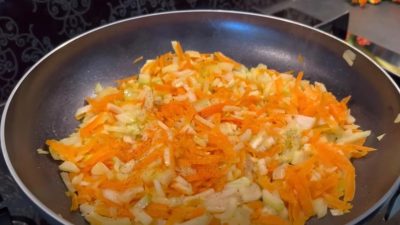 Obrane ziemniaki pokroić w kostkę i ugotować w osolonej wodzie do miękkości. Czosnek pokroić w kostkę, cebulę posiekać, a marchew zetrzeć na grubej tarce. Wszystko smażymy na patelni z odrobiną oleju, doprawiamy solą i pieprzem do smaku i smażymy przez 7 do 10 minut.
