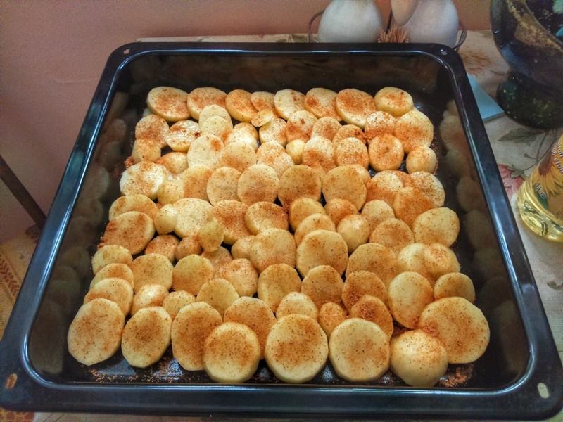 Przygotować marynatę z oleju, miodu piwnego i przypraw. Marynatą należy posmarować ziemniaki. Mięso zamarynować pozostałą marynatą. Ułożyć ziemniaki na blasze do pieczenia.
