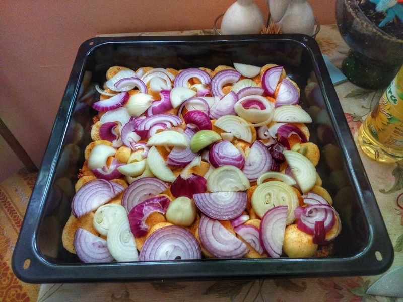 Cebulę pokroić w cienkie plasterki i ułożyć na warstwie ziemniaków. Następnie pokroić boczek w kostkę.