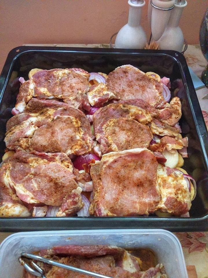 Na wierzchu ułożyć karkówkę z marynowanego mięsa wieprzowego.