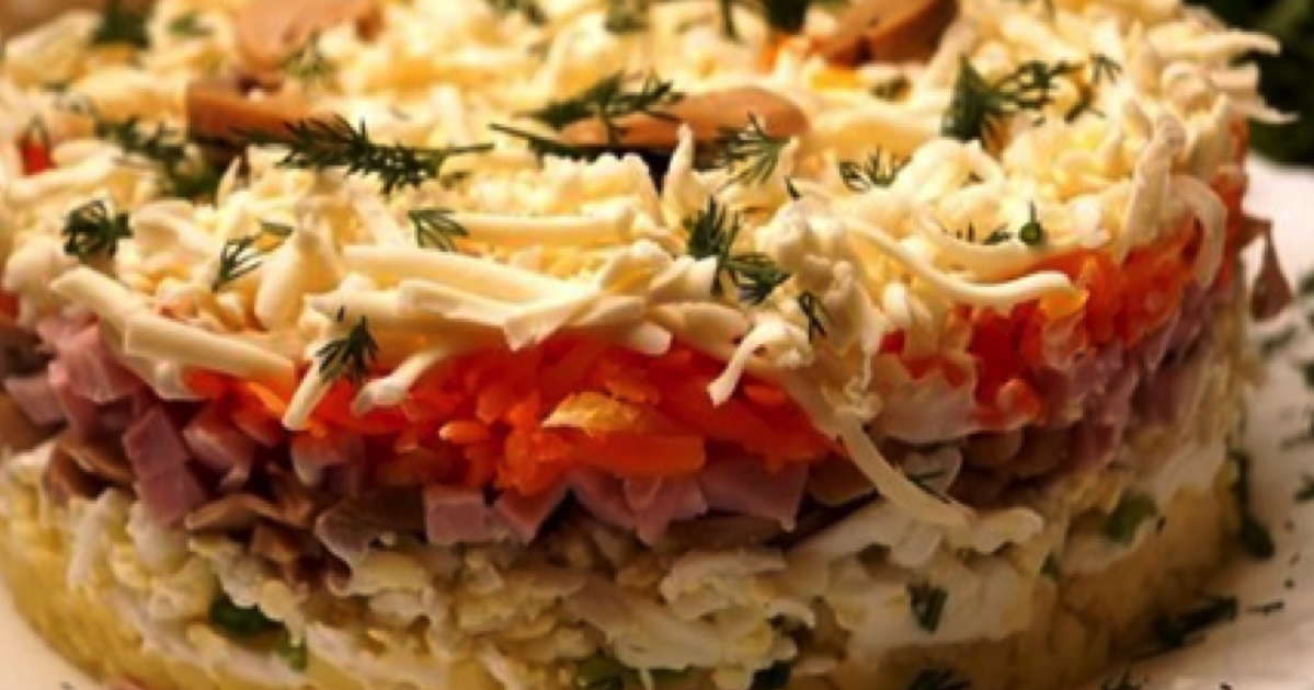 Ponownie posmaruj sałatkę majonezem i układaj marynowane pieczarki, które wcześniej należy odcedzić na sitku. Kolejny raz użyj majonezu do smarowania. Kolejna warstwa składa się z szynki. Na szynkę ułóż marchew i ponownie posmaruj majonezem.