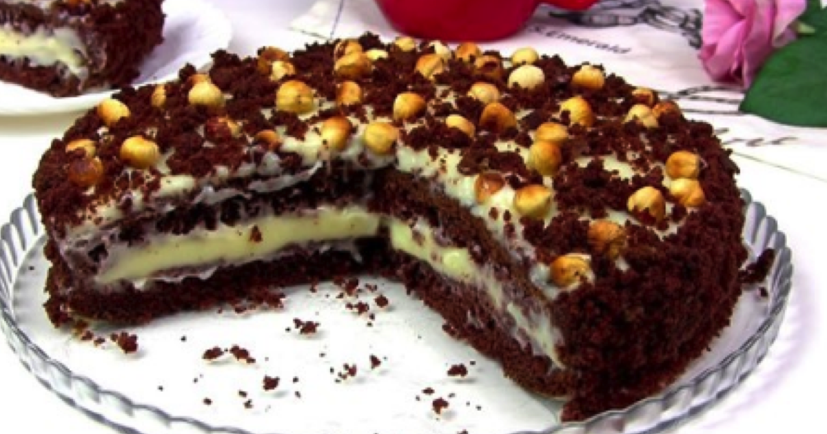 Gdy ciasto upiecze się i wystygnie, zdejmujemy z niego cienką, nierówną warstwę i przekrawamy resztę na dwie równe części. Na jedną z nich nakładamy krem, przykrywając ją drugą połówką. Odkrojoną warstwę mielimy blenderem, a następnie obsypujemy nią boki i górę ciasta, ponownie smarując je kremem.