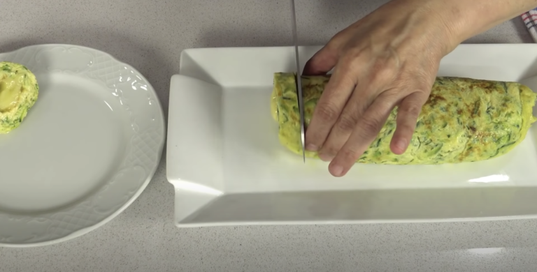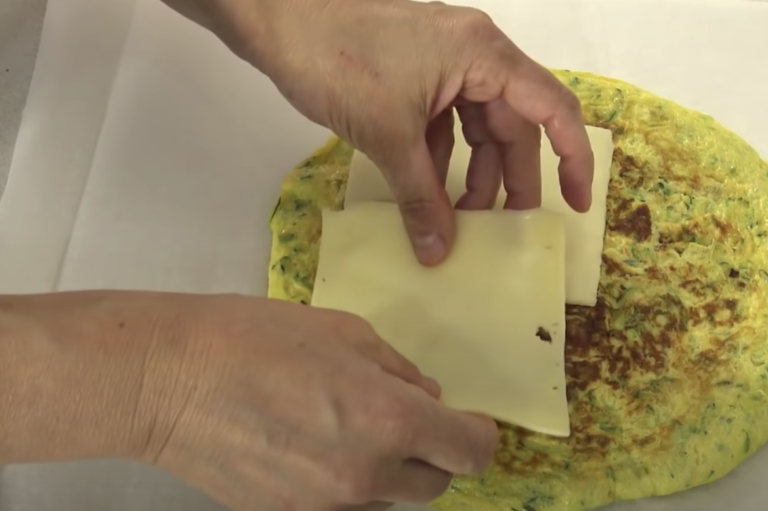 Następnie wyjmij go z patelni i od razu przełóż na papier do pieczenia. Połóż na nim plasterki sera, zwiń w rulon.