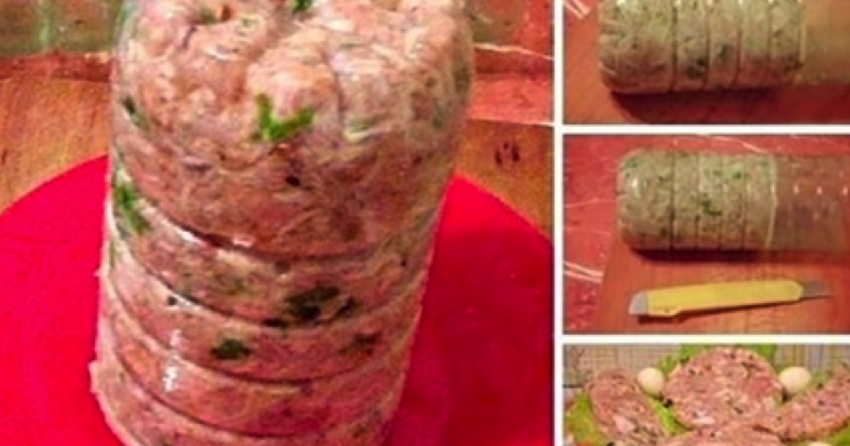 Do mięsa dla lepszego smaku można dać orzechy i podsmażoną cebulę. Kiedy rolada jest już gotowa wystarczy przeciąć butelkę i wyjąć ją.