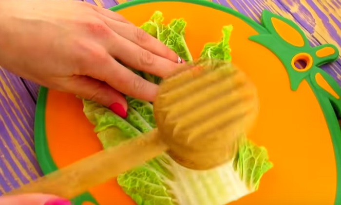 Podsmażone liście kapusty rozłóż na płaskiej powierzchni, węższą stroną przy wyciętym głąbie do dołu. Na środku liścia umieść niewielką ilość farszu, zostawiając miejsce przy krawędziach.