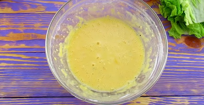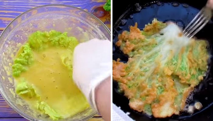 Każdy liść kapusty zamocz w przygotowanej masie, a następnie podsmaż na rozgrzanym oleju na patelni z każdej strony.