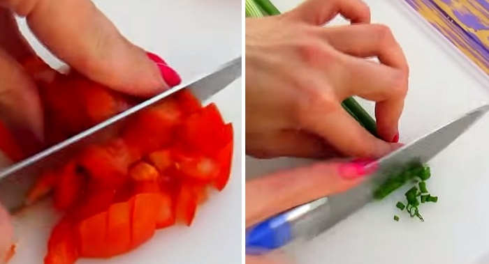 Umyte pomidory i szczypiorek pokrój drobno. Dodaj starty ser i szynkę pokrojoną w kostkę.