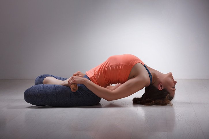 Ta pozycja łagodzi stres i poprawia koncentrację, sprzyjając całkowitemu spokojowi i relaksowi. Usiądź na podłodze w pozycji tureckiej, chwytając stopy rękami. Powoli połóż się tak, aby klatka piersiowa była uniesiona, a głowa skierowana do tyłu, dotykając ziemi czubkiem głowy. Oprzyj się łokciami o ziemię i pozostań w tej pozycji przez co najmniej minutę, pamiętając o głębokich oddechach.