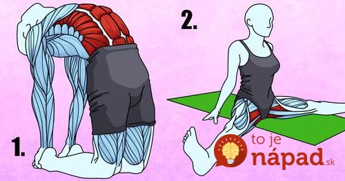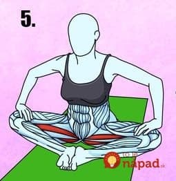 Usiądź wygodnie na macie i rozstaw stopy szeroko. Pochyl się do przodu, tak jak Twoje ciało Ci na to pozwoli. Powtórz kilka razy. To ćwiczenie rozciąga kręgi kręgosłupa (średnio można wydłużyć kręgosłup nawet o 7 cm), odmładza nerwy kręgosłupa, zwłaszcza odcinka lędźwiowego, oraz wzmacnia i odmładza mięśnie brzucha i dolną część pleców.