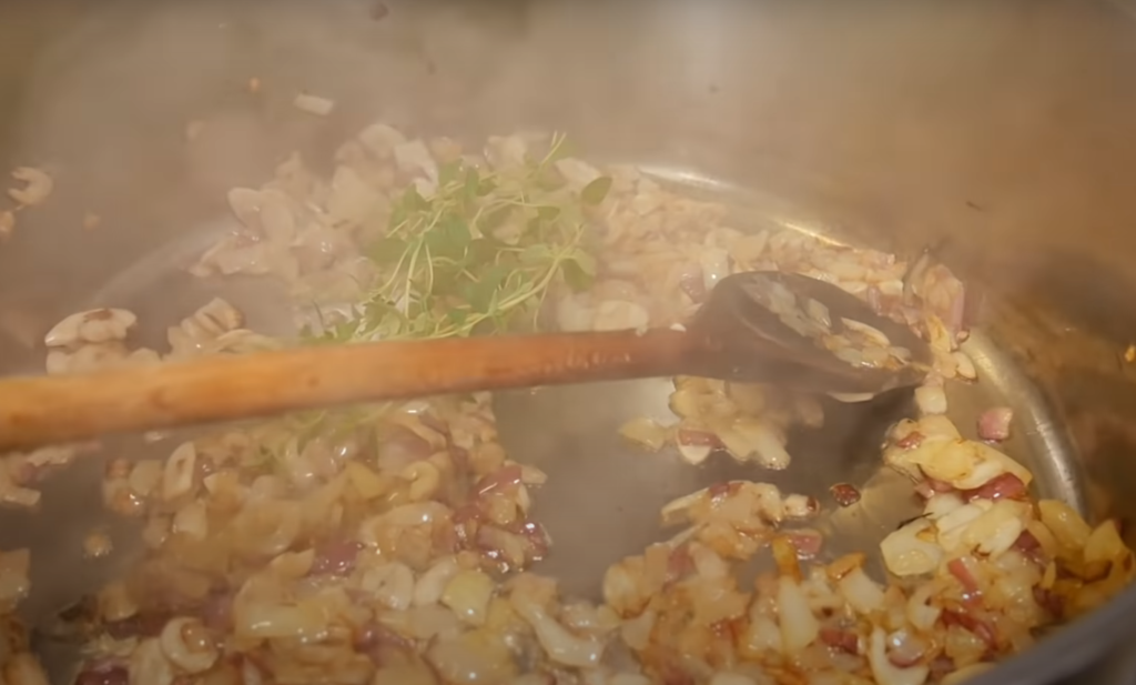 Włóż maść do garnka, podgrzej i dodaj drobno posiekaną cebulę. Nóżki grzybów pokrój drobno i usmaż. Dodaj trzy gałązki tymianku.