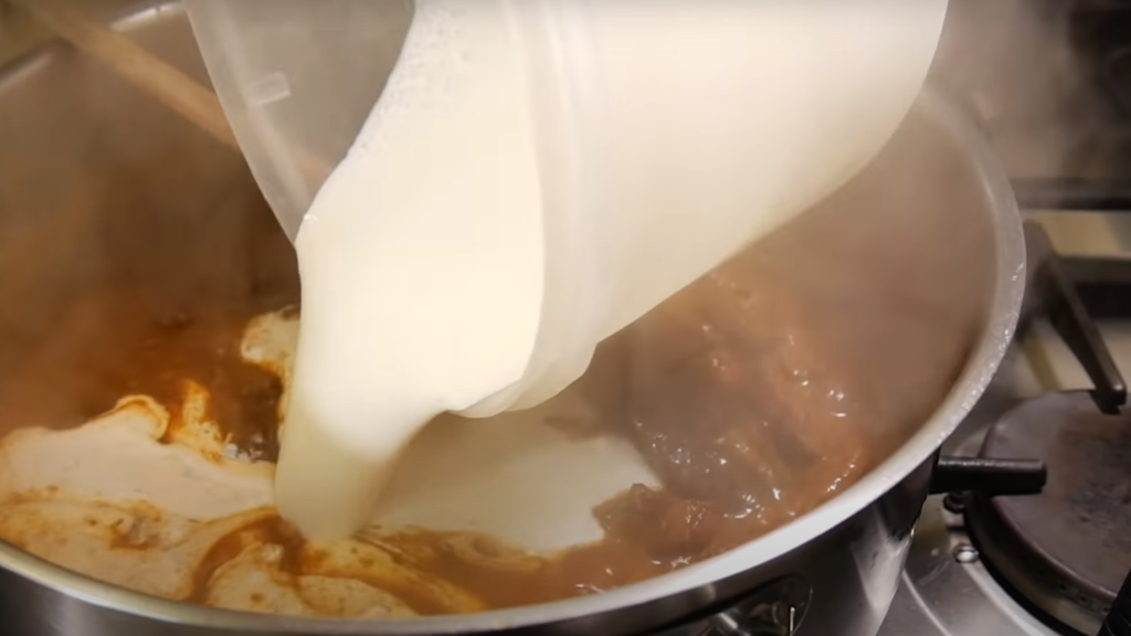Następnie mięso dodaj do garnka, w którym usmażyliśmy cebulę i polej bulionem. Dodaj sos Worcestershire. Śmietanę ubić trzepaczką i wymieszać z mięsem.