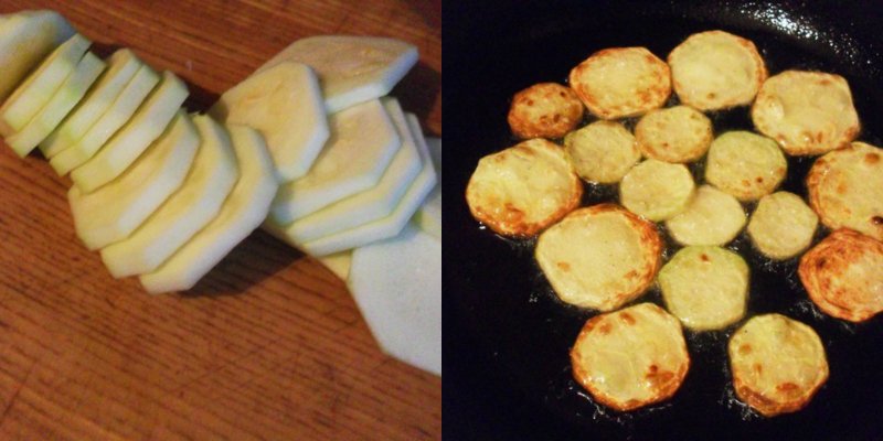 Na rozgrzanej patelni z olejem cukinię usmażyć z obu stron na złoty kolor. W celu usunięcia nadmiaru tłuszczu należy wyłożyć usmażone plasterki cukinii na ręczniku papierowym.