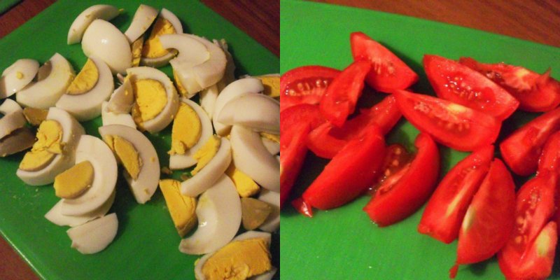 Po ostudzeniu cukinii, przeciąć na pół pierścienie. Pomidory pokroić w łódki, a jajka w półpierścienie. Cebulę, pietruszkę i czosnek posiekać.