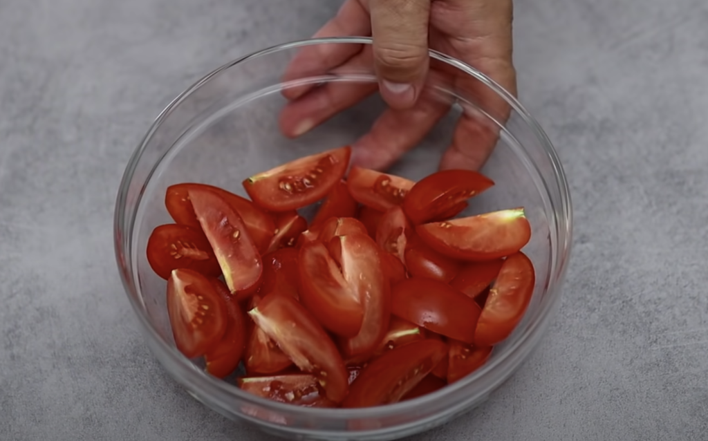 Umyj pomidory i pokrój je je na półksiężyce.