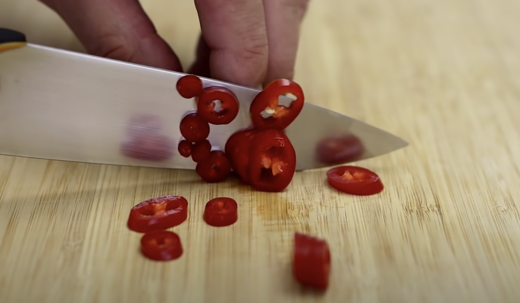 Drobno posiekaj papryczkę chilli i dodaj do pomidorów.
