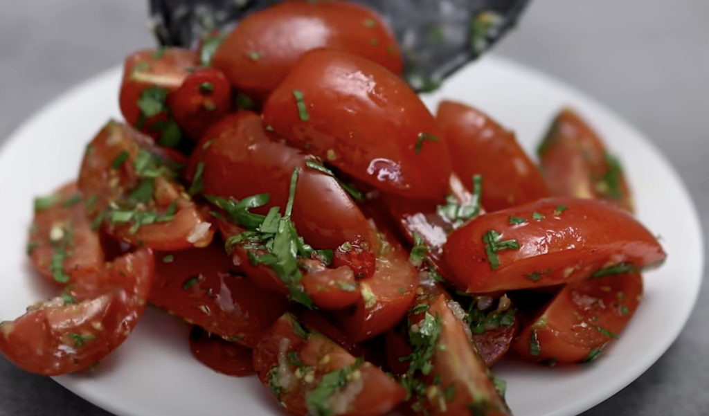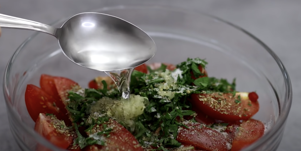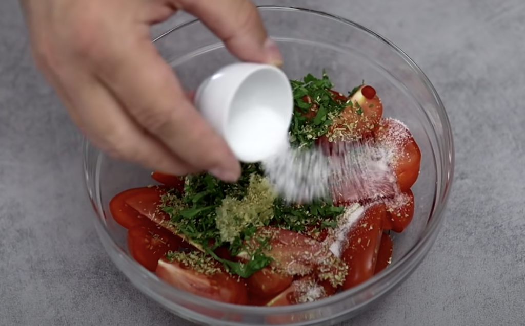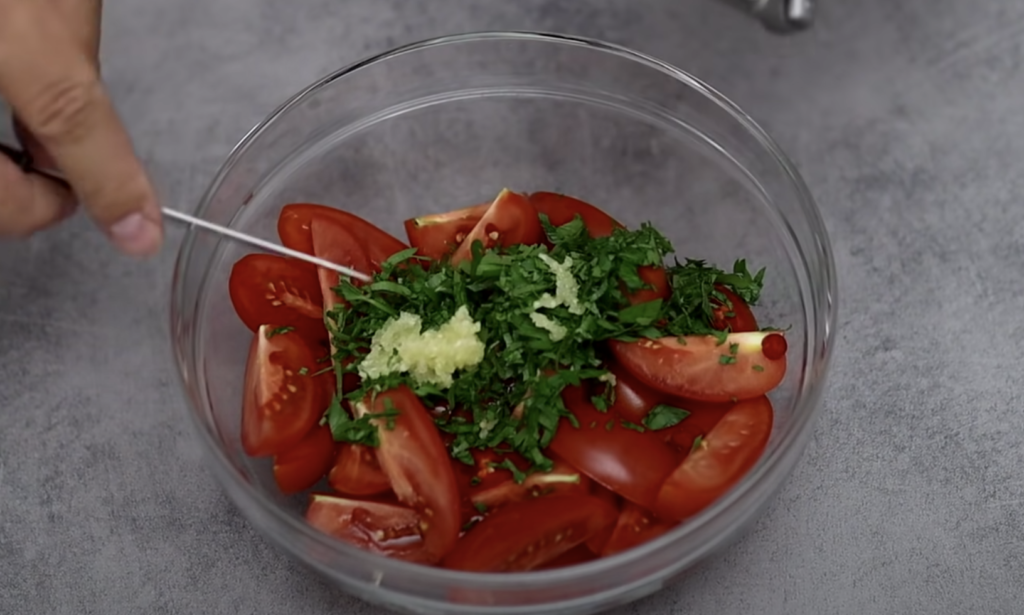 Wymieszaj z pomidorami, dodaj przeciśnięty przez praskę czosnek.