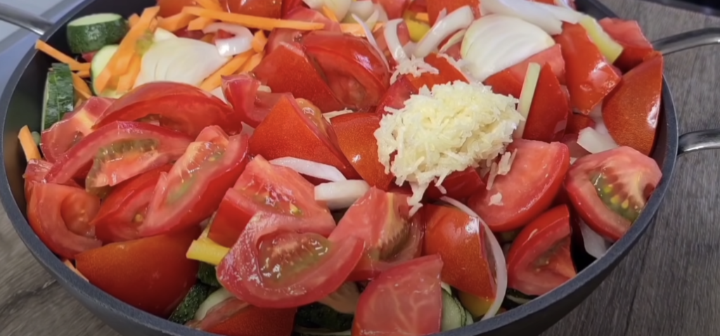 Pokrój pomidory na plastry. Po przygotowaniu warzyw, wymieszaj je w dużej misie, dodając zioła, cukier, sól, olej roślinny i drobno pokrojony czosnek.