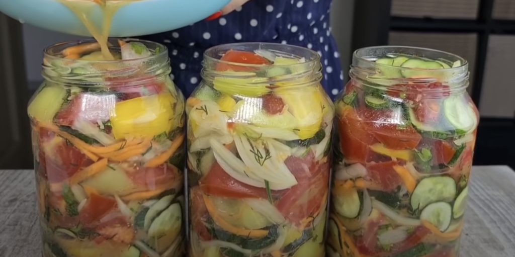 Następnie przygotuj sterylizowane słoiki. Włóż do nich warzywa i zalej je marynatą octową.