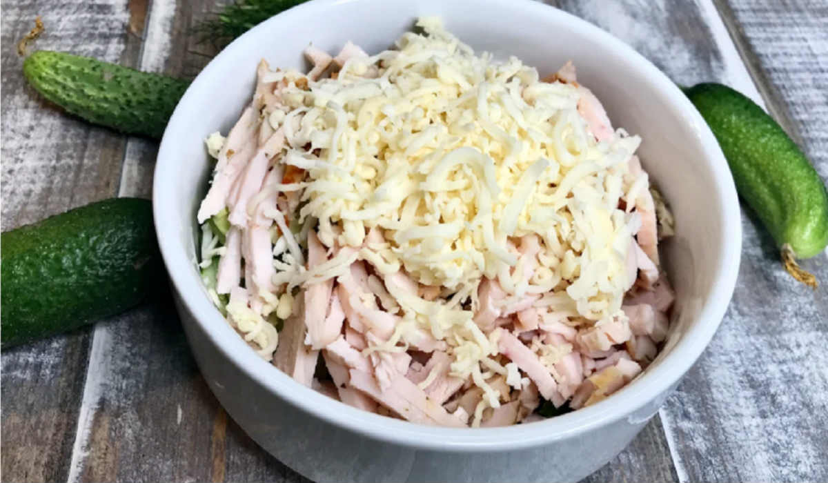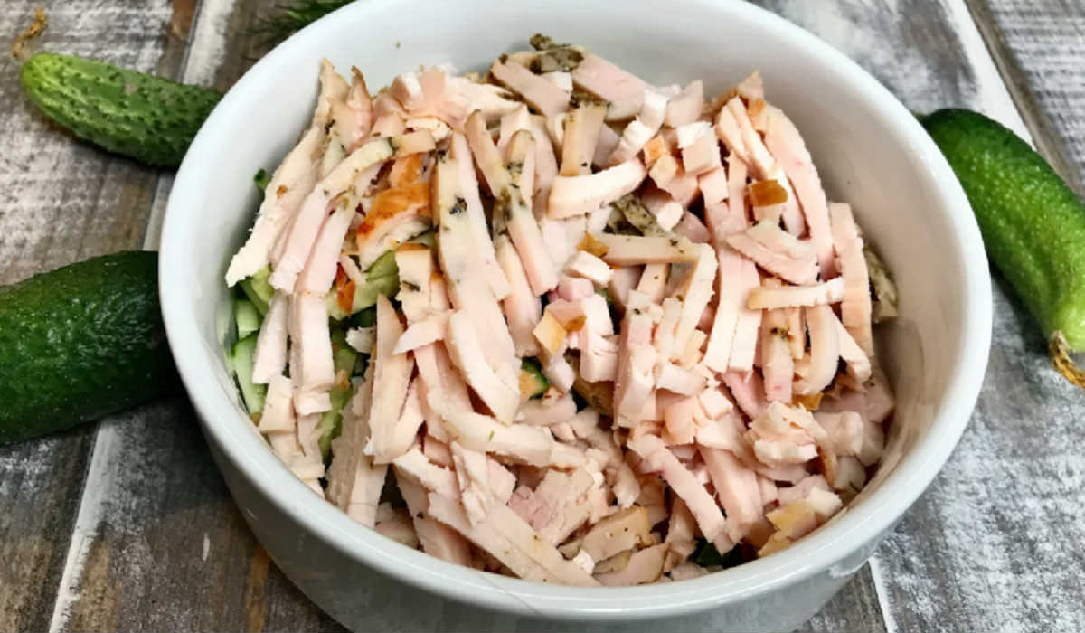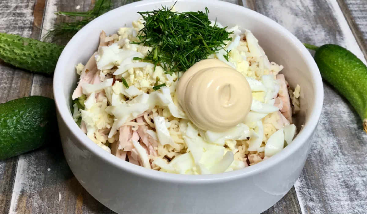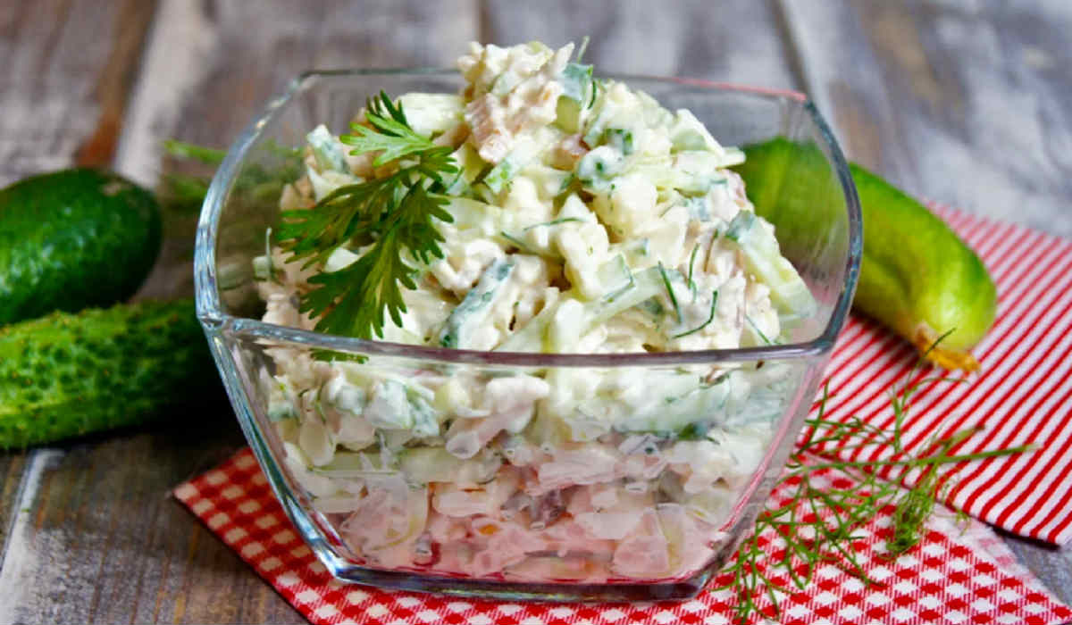 Ale produkt z kurczaka sprawi, że sałatka będzie bardziej delikatna. Zwróć uwagę na ogórek. Jeśli skórka jest gorzka, lepiej ją odciąć. Nawiasem mówiąc, zimą świeże ogórki można zastąpić solonymi.
