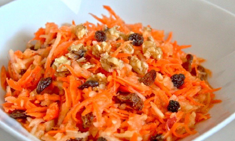Do startych marchewek dodaj odsączone rodzynki. Całość polej sosem i dokładnie wymieszaj. Sałatkę odstaw w chłodne miejsce na 15 minut. Gotowe.