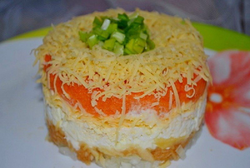 Sałatkę układaj warstwami: cebula-jabłko-jajko-marchewka z czosnkiem-ser. Na koniec możesz dodać odrobinę kefiru lub kwaśnej śmietany. Przypraw solą i pieprzem. Sałatka powinna odstać przez podaniem około 1,5 h w lodówce. Smacznego.