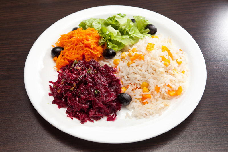 Buraka i marchewkę zetrzyj na tarce. Ryż wymieszaj z kukurydzą. Wszystko dopraw wedle uznania, ułóż na talerzu i posyp oliwkami. Z oleju, octu i sosu sojowego stwórz sos do polania dania.