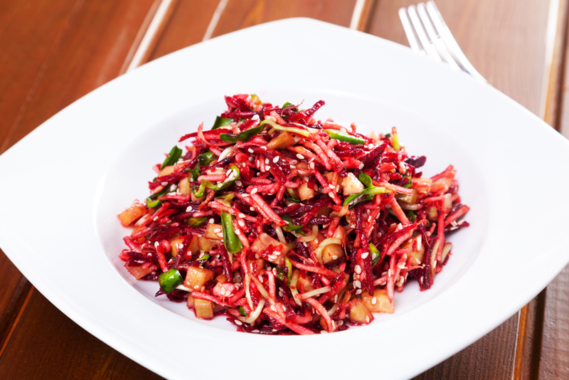 Umyte warzywa oraz jabłko obierz i zetrzyj na tarce o średnich oczkach. Cebulę i kapustę drobno poszatkuj. Wszystko wymieszaj, dopraw, polej octem i olejem.