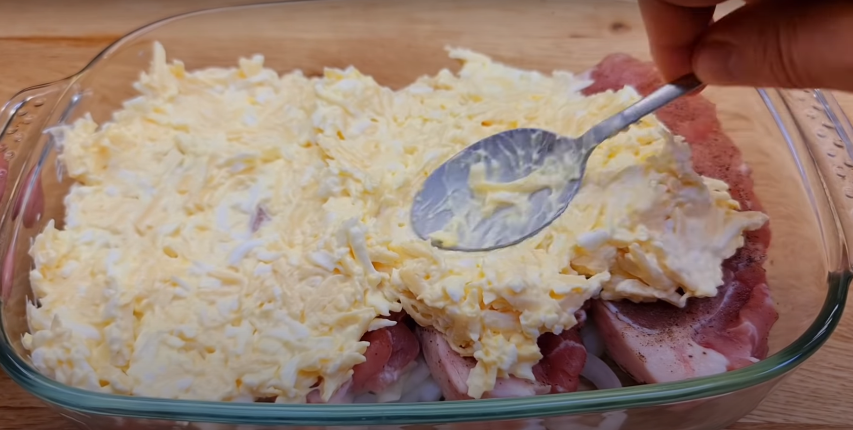 Posiekaj cebulę w tzw. piórka, po czym wyłóż ją na dnie przygotowanego wcześniej naczynia żaroodpornego. Na cebuli rozłóż nacięte i przyprawione kawałki schabu. Ugotowane jajka i ser zetrzyj na tartce o grubych oczkach do miski, dodaj sól i majonez, a później wymieszaj całość ze sobą. Tak przygotowaną pastę rozprowadź na kawałkach schabu w naczyniu żaroodpornym.