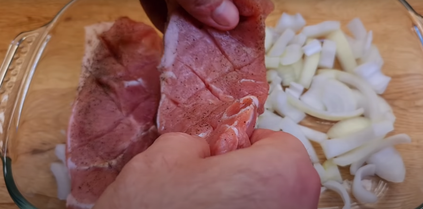 Natnij kawałki schabu nożem po przekątnej w taki sposób, aby stworzyć na nich wzór kratki (siatki). Następnie posyp je solą i pieprzem z obu stron.