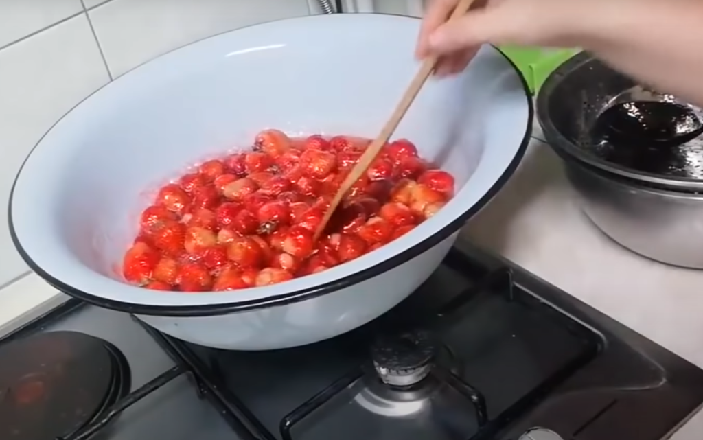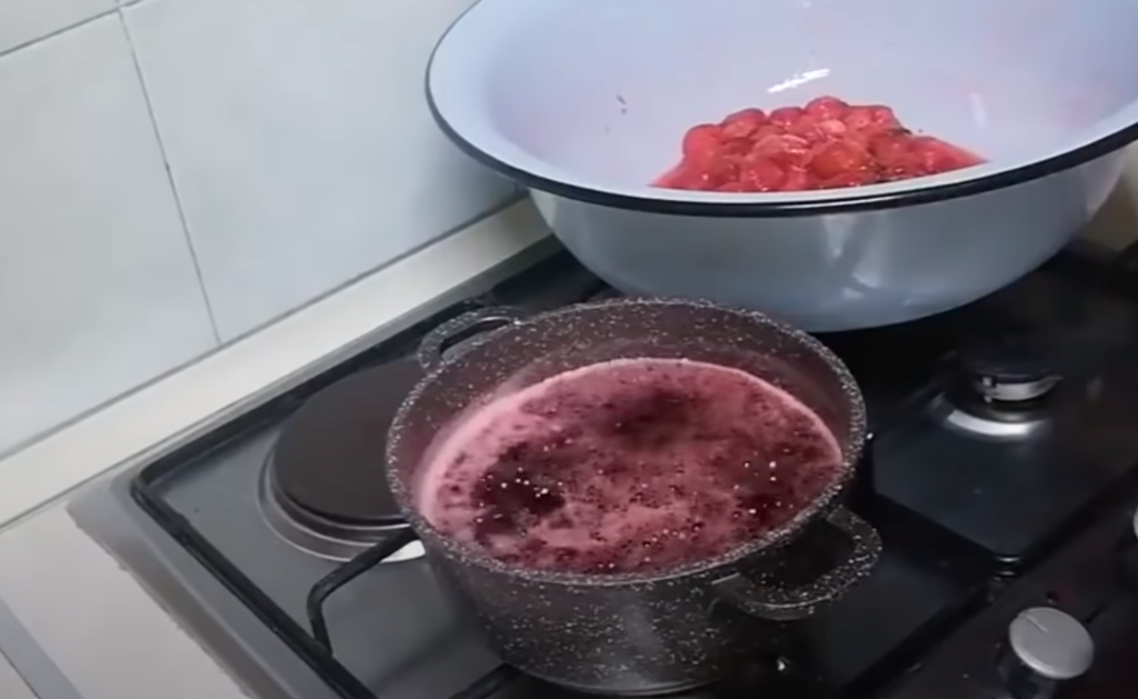Po ostudzeniu syrop przecedzamy do innego garnka, po czym ponownie gotujemy. Truskawki zalewamy wrzącym syropem.