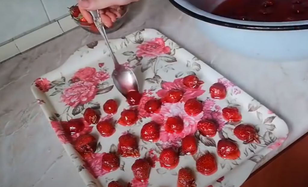 Proces przecedzania i gotowania syropu powtarzamy, ale teraz gotujemy go dłużej, aż osiągnie konsystencję rzadszego dżemu. Następnie zalewamy nim truskawki, doprowadzamy do wrzenia i gotujemy jeszcze minutę, po czym natychmiast wyłączamy ogień. Odczekujemy, aż wszystko ostygnie, a później wykładamy truskawki na tacę w taki sposób, aby nie dotykały się nawzajem.