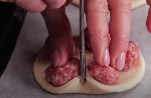 Arkusz ciasta francuskiego pokroić na 6 kwadratów. Mięso mielone wymieszać z drobno posiekaną cebulą, posolić i popieprzyć. Z mięsa uformować 6 większych kulek, każdą ułożyć na kwadracie ciasta, zawinąć w nie, zacisnąć łączenia i ułożyć na blasze wyłożonej papierem do pieczenia, łączeniem do dołu.
