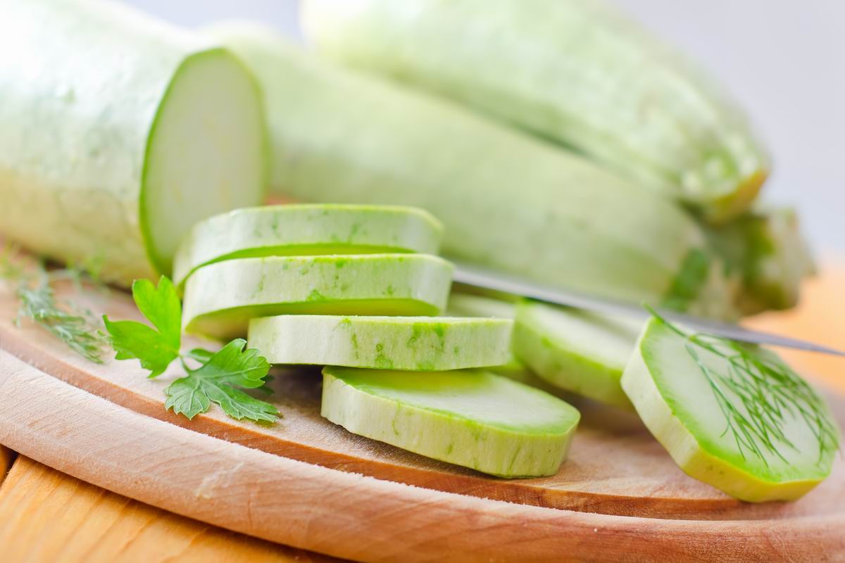 Cukinię pokrój w plasterki o grubości około centymetra. Skórę możesz usunąć lub pozostawić.