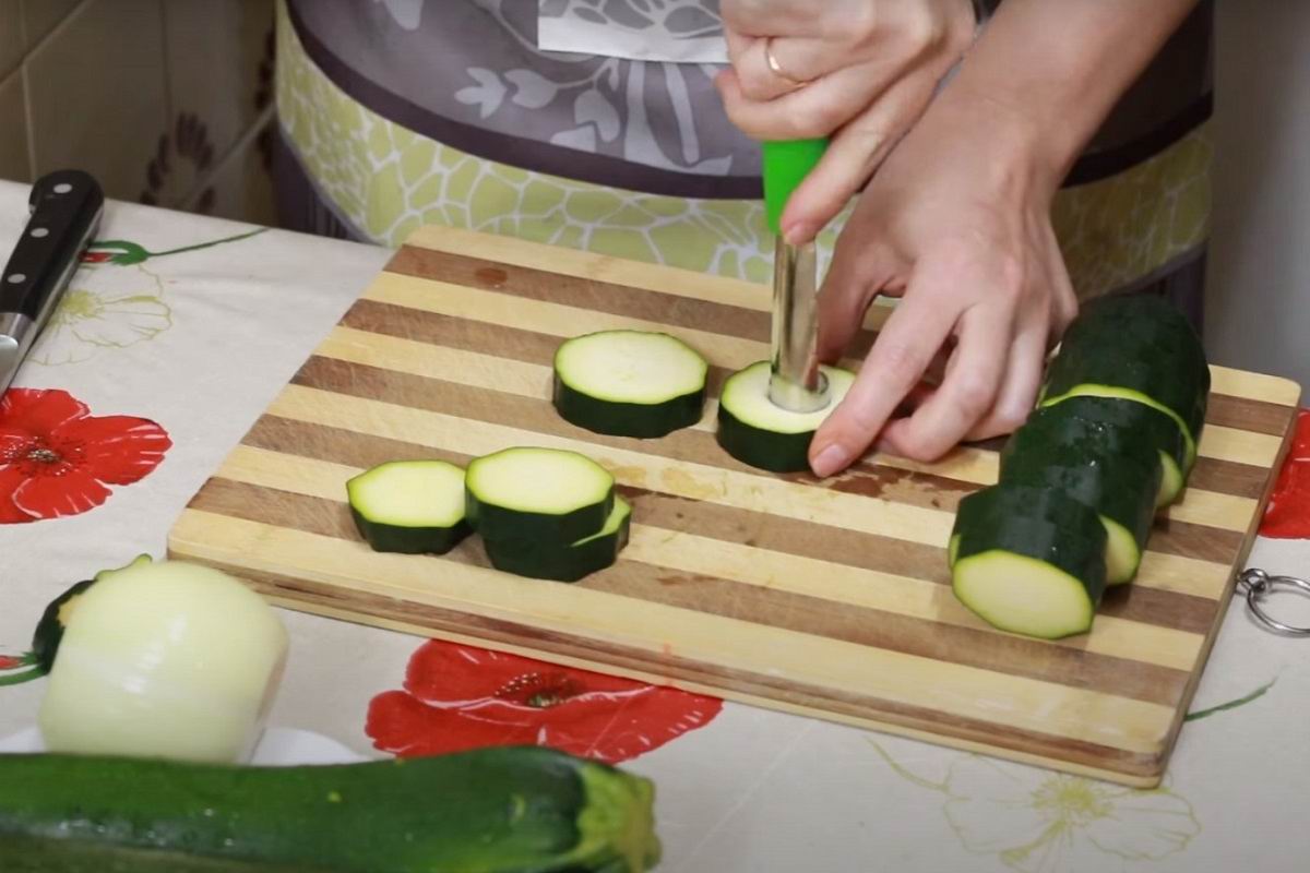 Użyj małego kieliszka, noża lub specjalnego narzędzia, aby zrobić dziurkę w środku każdego plastra cukinii. Nie wyrzucaj środka, nadal się przydadzą.