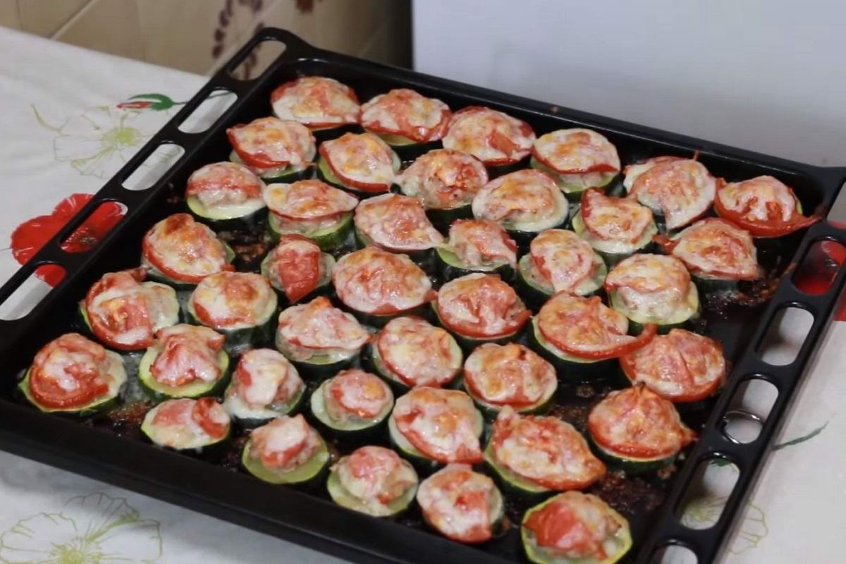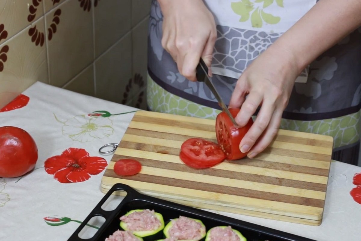 Pomidory pokrój w cienkie plasterki. Każdą cukinię przykryj ćwiartką pomidora.