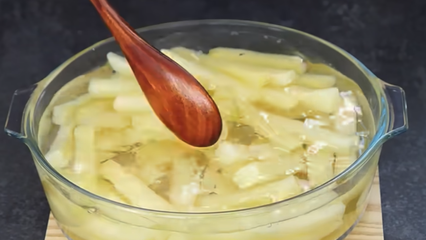 Obierz i pokrój ziemniaki na kawałki o równej wielkości. Umyj ziemniaki pod bieżącą wodą, aby usunąć nadmiar skrobi. Wlej wystarczającą ilość wody do garnka, dodaj ziemniaki i doprowadź do wrzenia. Gotuj ziemniaki przez 5 minut, następnie odcedź i przełóż do zimnej wody, aby zatrzymać proces gotowania.