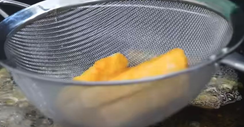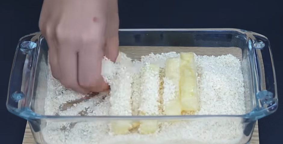 Po 30 minutach moczenia w zimnej wodzie, odcedź ziemniaki i pozostaw do wyschnięcia. Włóż ziemniaki do plastikowej torby, dodaj 25 g skrobi kukurydzianej i dobrze wymieszaj, aby pokryć ziemniaki skrobią. W osobnych miseczkach przygotuj roztrzepane jajka i bułkę tartą. Zanurz ziemniaki w jajkach, a następnie obtocz w bułce tartej.