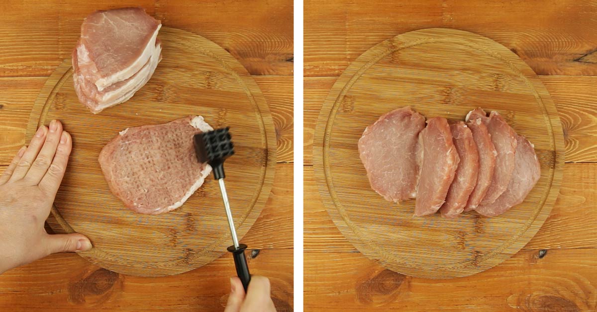 Rozpocznij od rozbicia mięsa, które może być wieprzowiną lub kurczakiem. Następnie przypraw solą, pieprzem i marynuj z ulubionymi przyprawami.