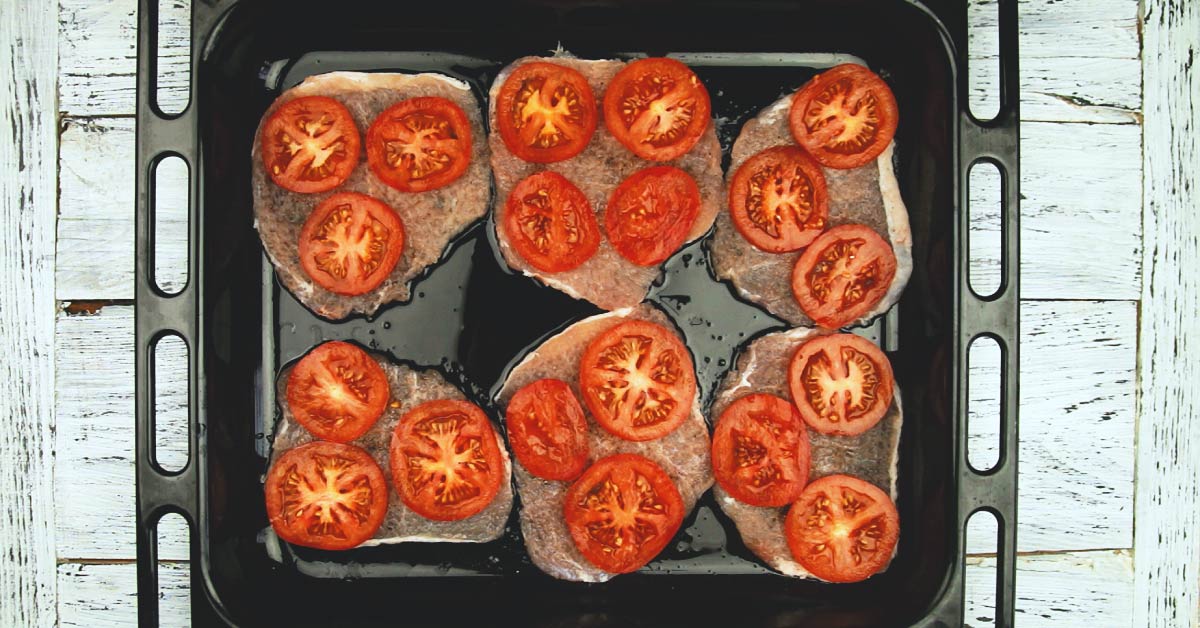 Pokrój cebulę w krążki, a pomidor w plasterki. Na blasze wyłożonej papierem do pieczenia ułóż cebulę, na niej kotlety, które smaruj musztardą i ułóż na nich plasterki pomidorów. Pomidory przypraw posiekanym czosnkiem, solą i pieprzem.