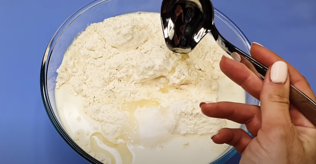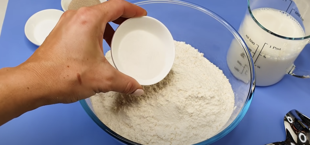 Na początku należy połączyć mąkę wraz z solą oraz 1 łyżką cukru.