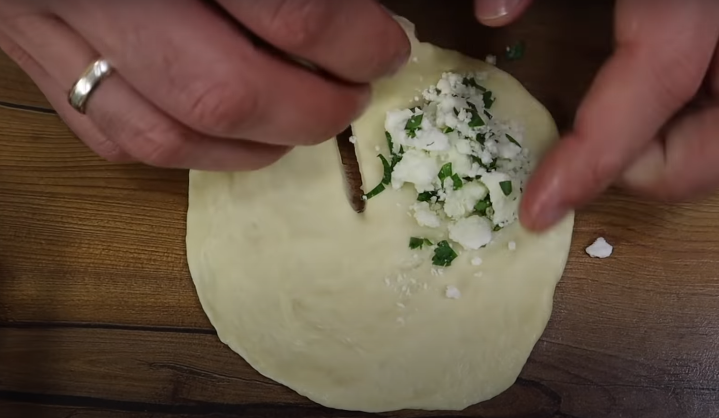 W międzyczasie przygotuj nadzienie. W tym celu wymieszaj serek z ziołami. Gotowe ciasto podziel na równe części i z uformuj z nich placuszki.